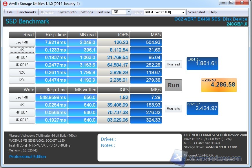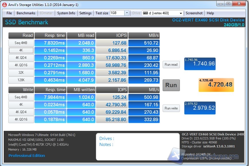 Questo nuovo bench introdotto nella nostra suite di test, chiamato Anvil's Storage Utilities, è pensato appositamente per gli SSD ed è in grado di testare i drive sotto ogni aspetto. I risultati ottenuti sono sempre molto elevati. Con lo stesso Benchmark abbiamo provveduto ad effettuare i test occupando lo spazio del drive, e possiamo notare che con il drive occupato al 100% le prestazioni sono rimaste invariate, fatta eccezione per la scrittura sequenziale in scrittura che è letteralmente crollata. Ovviamente ciò dimostra che è sempre bene lasciare un po’ di spazio libero, al fine di garantire il corretto funzionamento del drive.