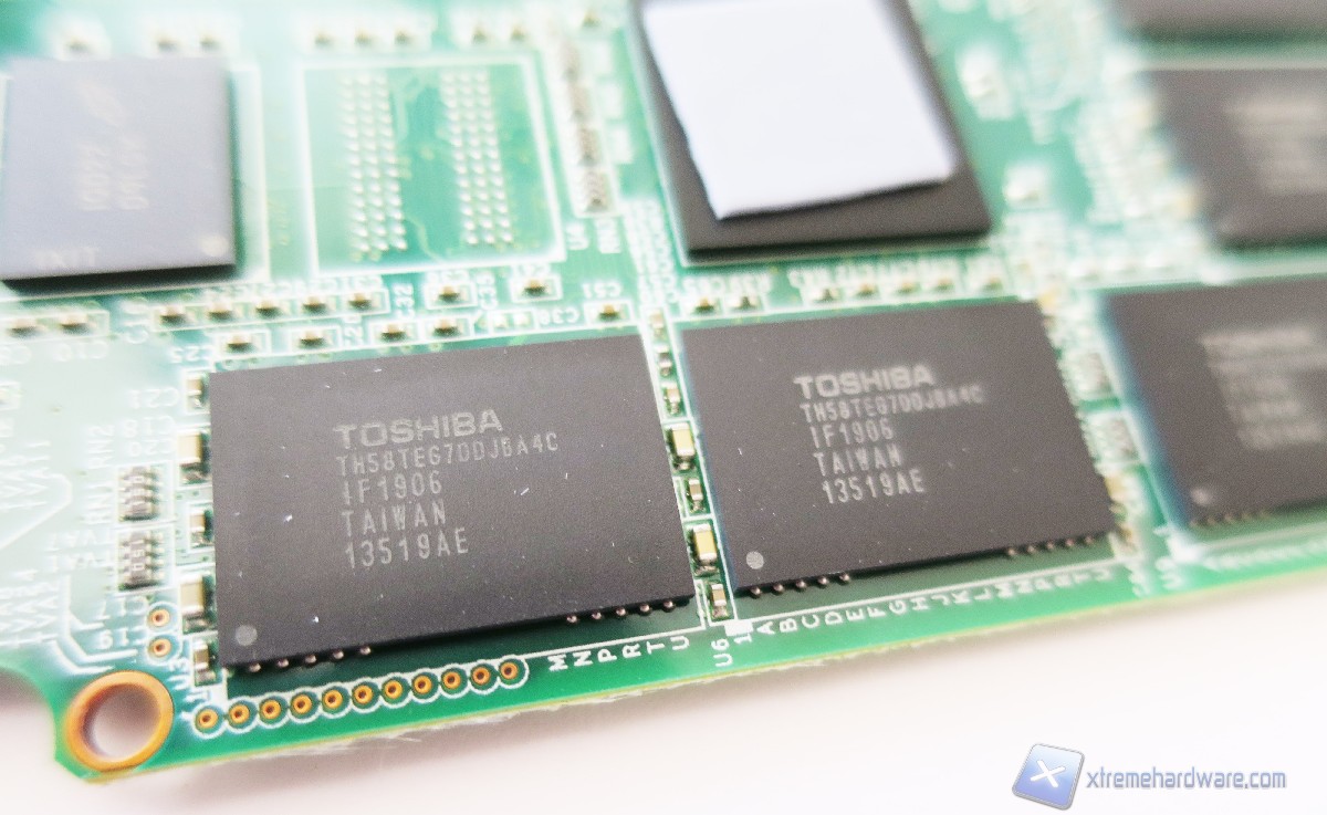 Proseguendo nell’analisi troviamo come abbiamo visto, lungo il perimetro, i chip di memoria Toshiba con sigla TH58TEG7DDJBA4C e processo litografico a 19nm. Sull’intero PCB sono ospitati ben sedici package di tipo 40 TSOP che hanno ciascuno una densità di ben 16GB (grazie a due die da 8GB). Nel dettaglio tali chip sono NAND Flash Toggle Mode sincrone con un sistema MLC (Multi Level Cell) a due bit per cella. La loro vita stimata è di circa 3.000 cicli di scrittura. Come sappiamo inoltre un’interfaccia di questo genere permette un maggior scambio di dati con conseguente innalzamento delle prestazioni generali del drive.